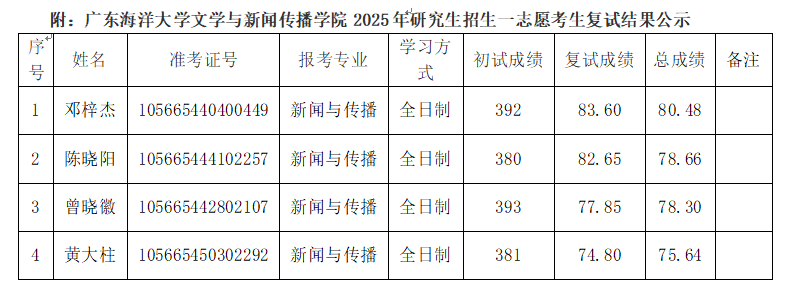 根据公司及公司研究生招生工作的相关文件精神和要求,经公司研究生招生录取工作领导小组审定,将公司2025年硕士研究生第一志愿考生复试结果按照最终得分进行排名,现予以公示。