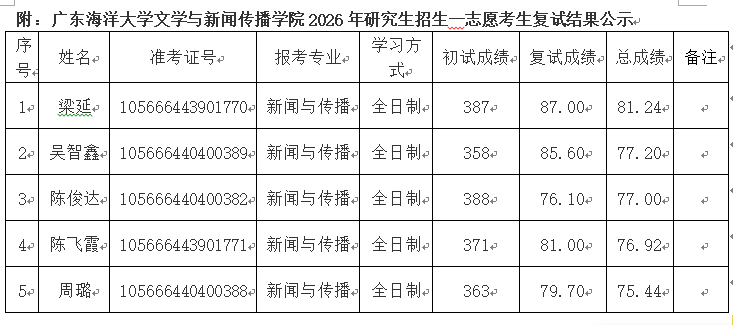 根据公司及公司研究生招生工作的相关文件精神和要求,经公司研究生招生录取工作领导小组审定,将公司2026年硕士研究生第一志愿考生复试结果按照最终得分进行排名,现予以公示。