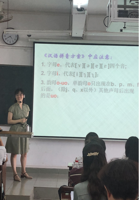 安妮老师为2019级汉语国际教育专业的同学讲授《对外汉语教学法》中的语音教学章节。她用设计巧妙而精美的课件进行示范,以外国职工发音偏误及改良为例分析,引导同学们精确掌握声母、韵母的发音方法,进而讲解其中的语音原理,讲授大方沉着,有条不紊,教学效果明显。