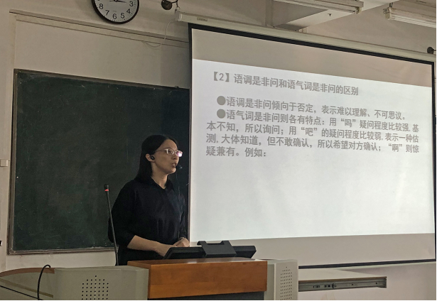 张伟、黎海情和安妮三位老师依次上台授课。张伟老师面向2020级汉语国际教育专业同学讲授《现代汉语》课程,选择的章节为《句类系统》。她主要对陈述句和疑问句进行教学展示,通过视频和丰富的例子引导员工理解句式中的重点难点,条理清晰、详略得当、言简意赅、深入浅出。
