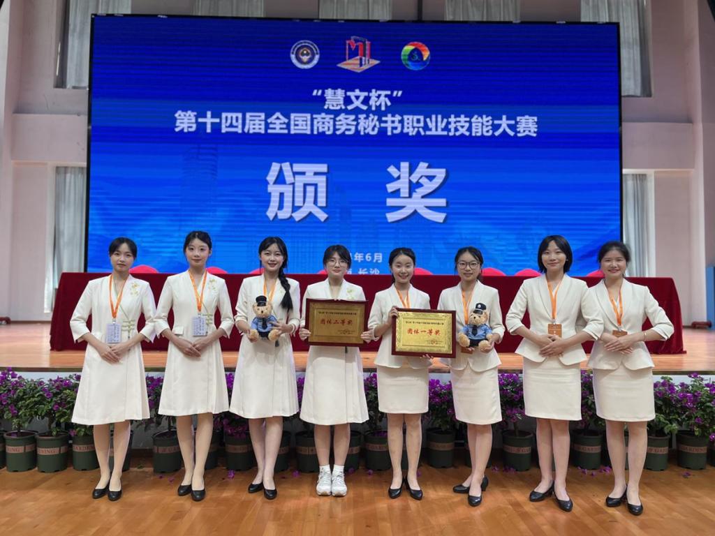 “慧文杯”第十四届全国商务秘书职业技能大赛于5月31日至6月2日在湖南司法警官职业公司举行。经过层层激烈角逐,由张玉妹与陈志敏老师带领的威廉希尔WilliamHill2队(周雅琪、温钰怡、伍朵朵、陈贻怡)荣获本科组团体一等奖,由邱天与高博老师带领的威廉希尔WilliamHill1队(董泳琦、冯艺扬、张嘉怡、曾雅妍)荣获本科组团体二等奖,周雅琪同学荣获个人专项事务处理一等奖。