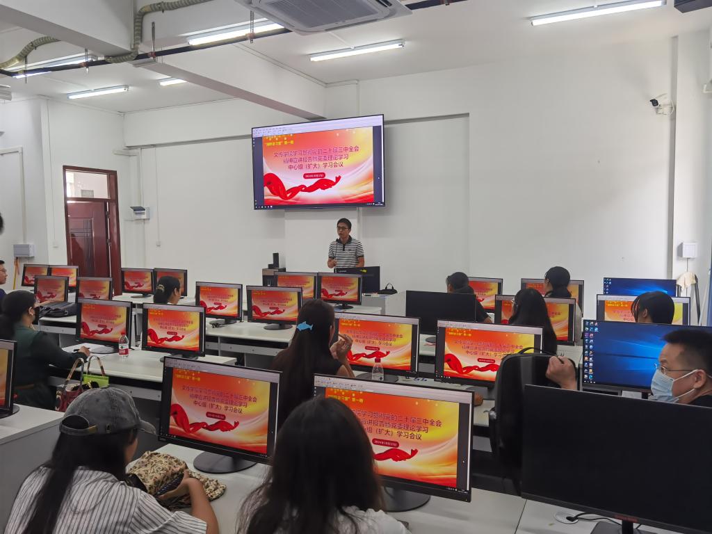 10月23日下午,WilliamHill中文官网在新文科楼3号楼405室举行学习贯彻党的二十届三中全会精神宣讲报告暨党委理论学习中心组(扩大)学习会议,这也是公司“湖畔讲习堂”开展的首期活动。公司党委书记张艳梅主持会议。公司全体教职工及部分青年员工骨干等近80人参加学习。