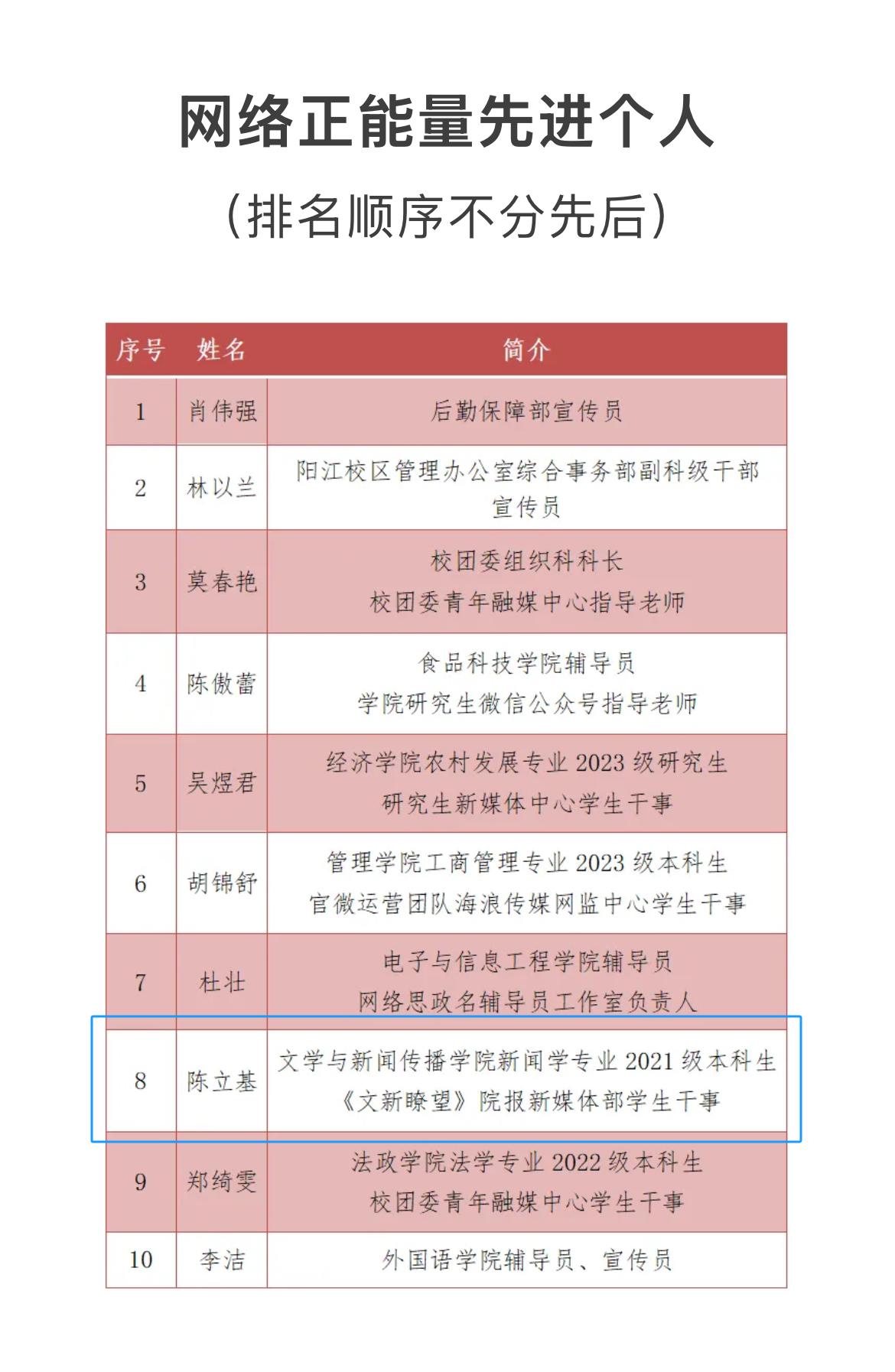 其中,王丹教授任主委的九三学社海大基层委员会获得“九三学社全国宣传思想工作先进单位”表彰,公司党委书记张艳梅获得中华出版促进会教育新闻专业委员会“从事高校校报编辑工作满20年”表彰,武会园老师指导“文传智创公众号”赵婉蓉、邓玉婷、丁思媛同学创作的推文《青春当“燃”,热血非凡》获得“校园正能量新媒体作品”(共12件)表彰,陈立基同学获得“网络正能量先进个人”(共10名)表彰。