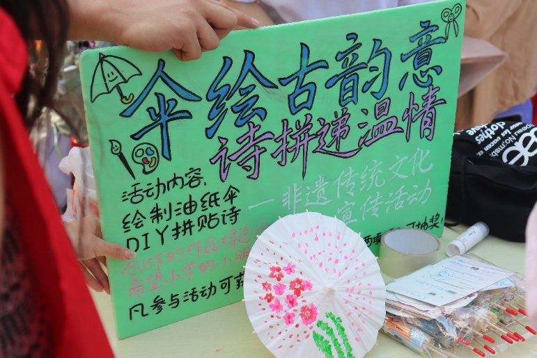 为了响应新时代传承与弘扬中华优秀传统文化的号召,进一步宣扬非物质文化遗产,同时鼓励海大学子积极参与爱心行动,向希望小学传递关爱和正能量,院青协于11月16日在公司西岭食苑门口和商业中心举办了“伞绘古韵意,拼诗递温情”非遗传统文化宣传活动。此次活动共设手绘油纸伞、DIY拼贴诗、书写祝福卡片、以及幸运抽奖四个环节。