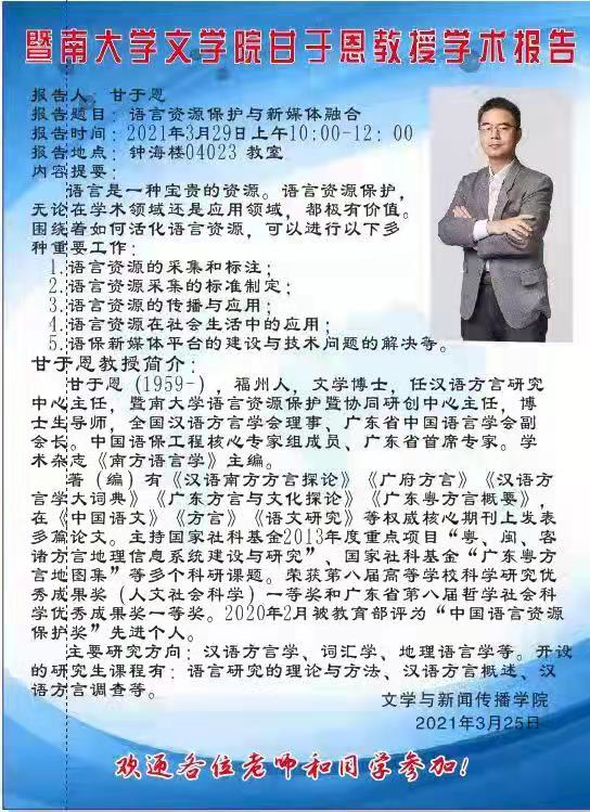 上一条:暨南大学文公司甘于恩教授受邀莅临海大讲学