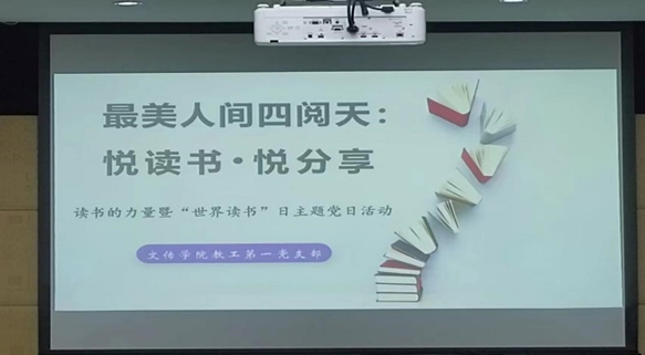 活动由支部书记沈晓梅老师主持,以“最美人间四阅天:悦读书·悦分享”为主题,通过学习习近平总书记关于读书的重要论述,观看纪录片,解读精彩篇章,读书故事分享、交流等形式展开。