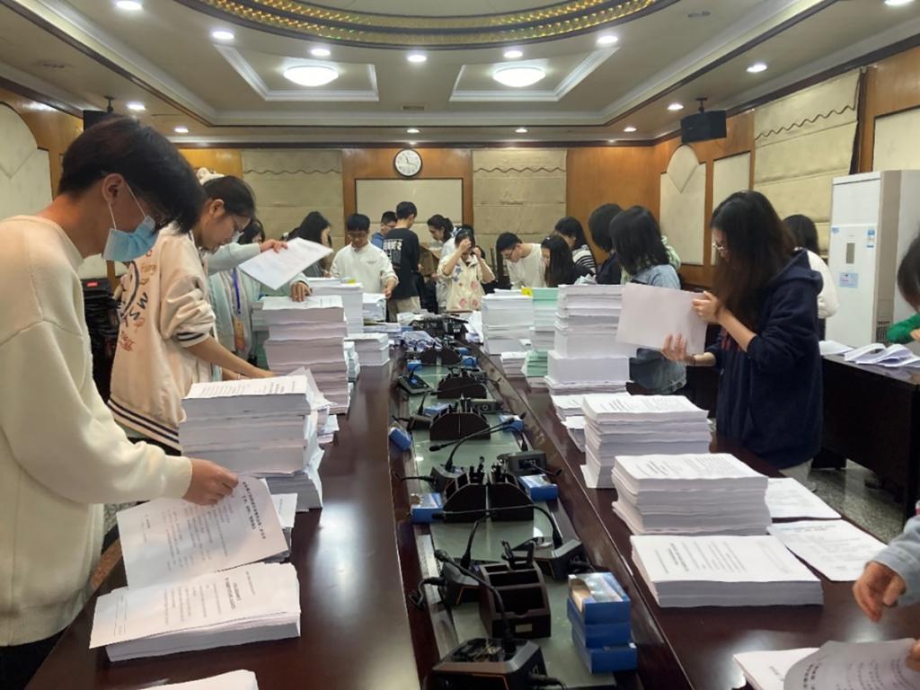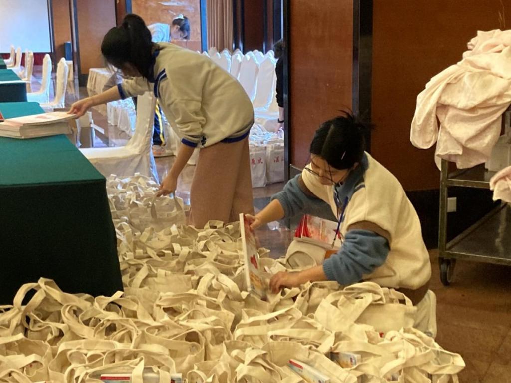 会议开幕的前一天,志愿者们先是在政协议政厅集合,明确会议流程、工作内容和志愿服务注意事项,对会议所需材料进行分装,之后前往皇冠假日酒店布置报到现场。