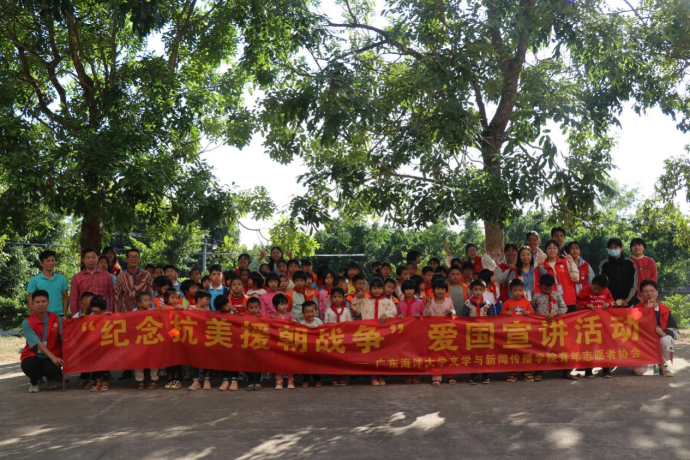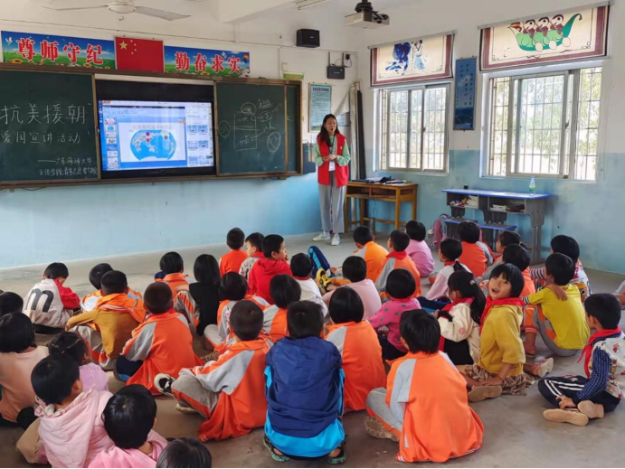 2021年11月10日下午,WilliamHill中文官网青年志愿者协会一行20余人前往湛江市黄桐希望小学进行“纪念抗美援朝战争”爱国宣讲活动。活动共持续两个半小时,生动的课堂教学和手工环节,既让孩子们气氛十分活跃,也加深他们对抗美援朝历史的了解。