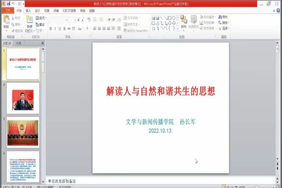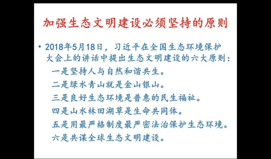 孙长军以“人与自然和谐共生”为主题,解读习近平总书记于20185月在全国生态环境保护大会上的讲话中提出的生态文明建设六大原则。同时,解读《习近平谈治国理政》第三卷中的第十三个专题“促进人与自然和谐共生”。他要求大家树立尊重自然、顺应自然、保护自然的理念,贯彻节约资源保护环境的基本国策,把生态文明建设融入经济、政治、文化、社会建设之中,建设美丽中国。在新时代真正实现人与自然和谐共生,让我们生活的环境越来越好。