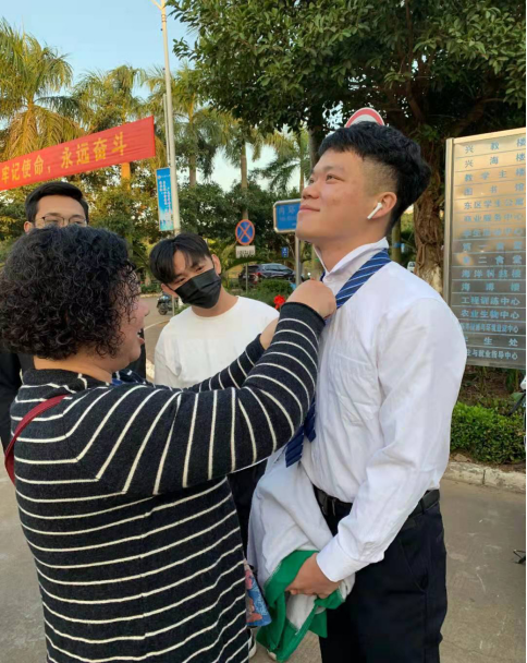 廖老师始终以一个陪伴者的身份站在员工身侧。新生入学军训时,廖老师每天都会到场,陪着他们一起流汗晒太阳,当发现员工身体不适时,她便立即向教官反映情况,保障员工的身体健康。而在日常生活中,廖老师会时常到员工宿舍探访,关心他们的衣食住行。通过对员工日常生活的观察,廖老师借此也对员工的贫困认定情况是否属实的问题作出了判断,她表示“钱要用在刀刃上”。当有员工生病住院时,即使路途遥远,廖老师也会在第一时间赶去医院,像是员工的定心丸和主心骨,她的出现总能给员工带来安心的感觉。有一年国庆假期,台风“彩虹”来袭,公司停水停电,道路不通,留校员工的手机电量和信号皆无,校园内的自动取款机无法取款,情况很糟。辗转反侧之下,廖老师驱车绕路到公司亲自确认员工的情况,她的心在见到员工的那一刻终于定了下来。